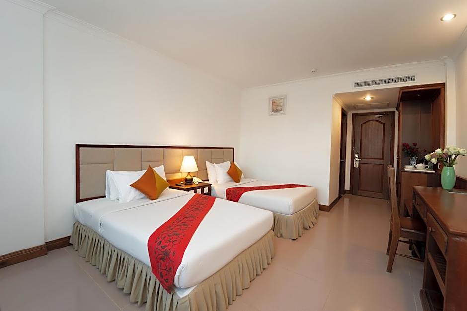On-site Restaurant #1 serves American and Asian cuisines, making meals convenient after a day of exploring Siem Reap. The outdoor pool area includes a dedicated kids’ pool for younger travelers, with free private parking and complimentary Wi-Fi adding to the ease of a relaxed stay. For added convenience, a 24-hour front desk, room service, and a tour desk are on hand, while shuttle services (plus an airport shuttle) and meeting/banquet facilities are available for an extra charge.